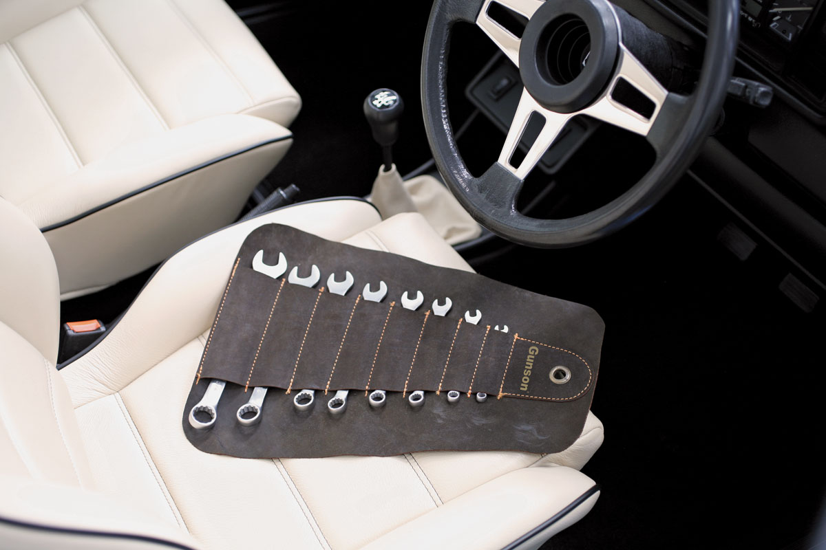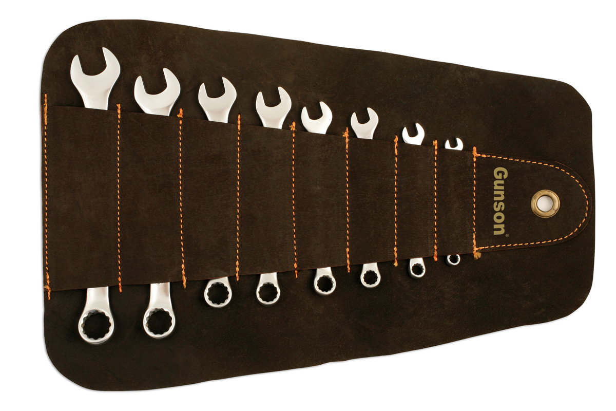 An 8-piece set of metric combination Bi-Hex (12-point) spanners, ranging from 8mm to 19mm. Manufactured from chrome vanadium steel with a satin finish, and supplied in an oiled leather tool roll.